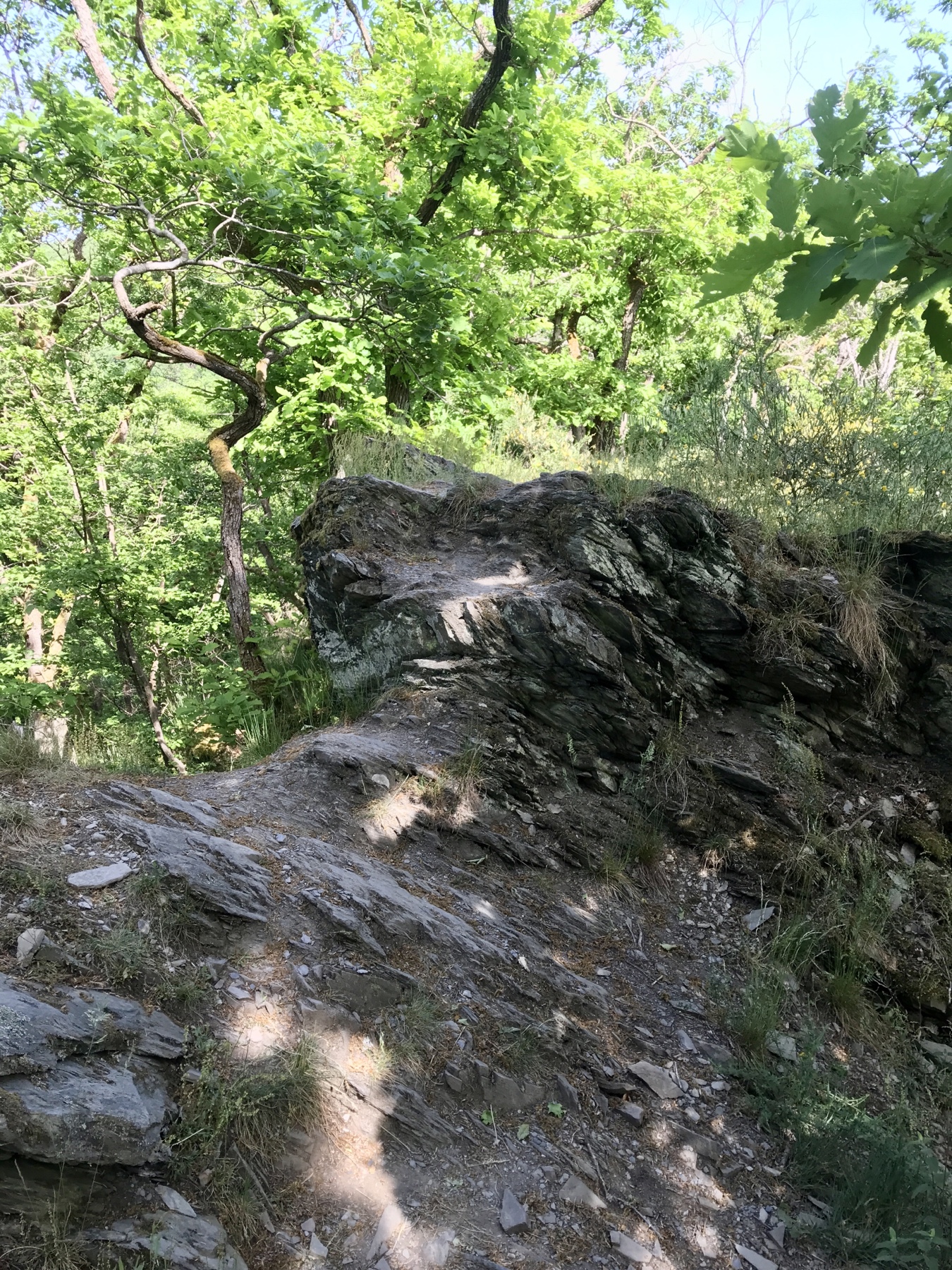 Bei der Lei, Lay, Lai handelt es sich übrigens um die Felsvorsprünge, denen ich die vielen wunderbaren Aussichten verdanke. Das altsächsische Wort für Felsen oder Felsplatte ist im rheinischen und niederdeutschen Sprachgebrauch erhalten geblieben. Bekannteste ihrer Art ist sicherlich die Loreley am Rheinsteig neben der Ursula in Brüssel.